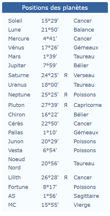 Si on compare les 2 thèmes d’une personne née le 07/07/22 à 17:39, il faut prendre les mêmes planètes, c’est à dire :